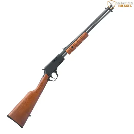 Calibre .22LR, cano 18, sistema de funcionamento Pump Action, capacidade de 15+1 disparos, coronha em madeira, receptáculo em alumínio, trilho para fixação de acessórios ópticos do tipo ‘rabo de andorinha’ e sistema de ejeção lateral, alça e massa de mira. Trava de segurança manual tipo botão. Acabamento do cano: oxidado negro. Carregador Tubular.