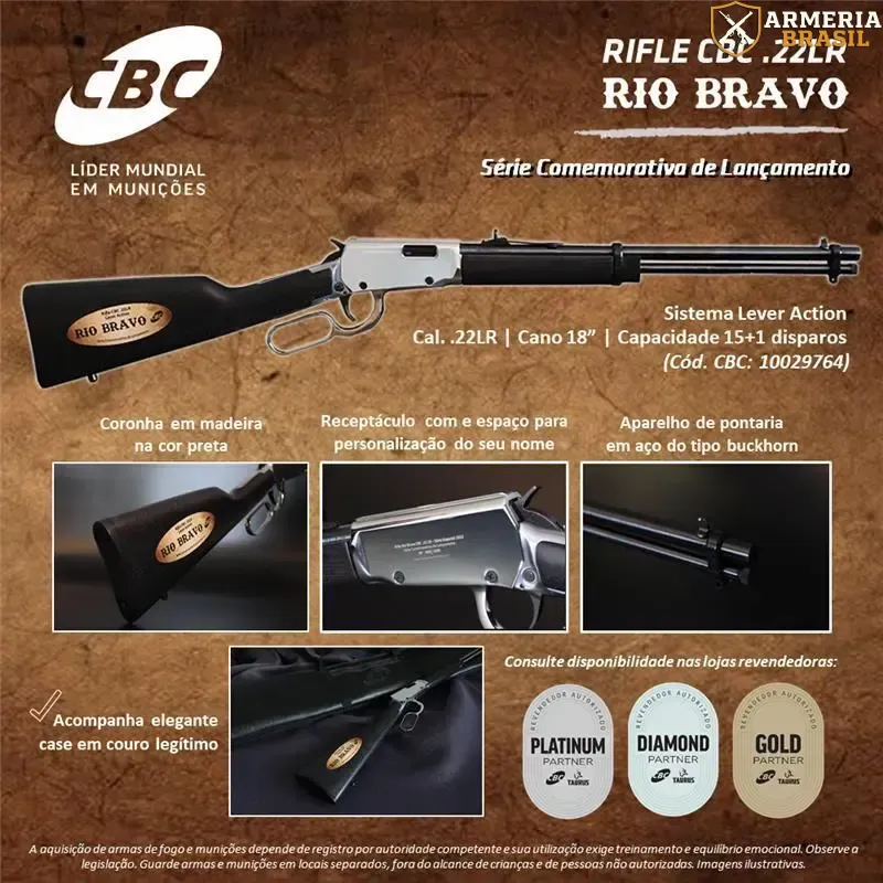 Calibre .22LR, cano 18″, sistema de funcionamento de repetição por alavanca (Lever Action), coronha em madeira, capacidade de 15+1 disparos, receptáculo em alumínio, trilho para fixação de acessórios ópticos do tipo ‘rabo de andorinha’ e sistema de ejeção lateral. Aparelho de pontaria de fibra óptica e alça de mira com regulagem micrométrica vertical e horizontal, massa de mira e túnel de proteção removíveis. Trava de segurança manual tipo botão. Acabamento do cano: oxidado negro. Carregador Tubular. Peso: 2,54 kg